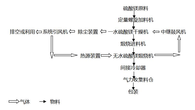 公司结合多年硫酸镁干燥经验设计研发的无水硫酸镁成套设备分为两段:高温段为煅烧段。高温段所需能量为燃烧炉直供。低温段为干燥段,其能量来源为煅烧段排气