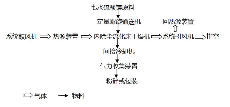 公司在七水硫酸镁干燥方面有着丰富的经验,开发设计制造了采用内除尘流化床干燥机烘干硫酸镁。待烘干物料由定量加料输送机械送入流化床干