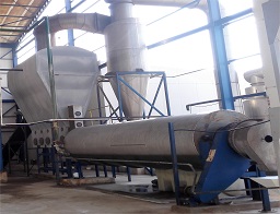 公司研发的片状二水氯化钙干燥成套装置可以对经过冷却结片机结片后的片状二水氯化钙进行高温干燥连续化生产。通过与浓缩装置连锁,可以实现自动化生产,经蒸发浓缩浓度达到68%--70%的氯化钙溶液由冷却结片机产出片状氯化钙再经皮带输送机送入流化床干燥机,在主机内与干燥介质进行充分热交换,完成干燥作用,主机排出的干产品经冷却器冷却后作为成品被包装。