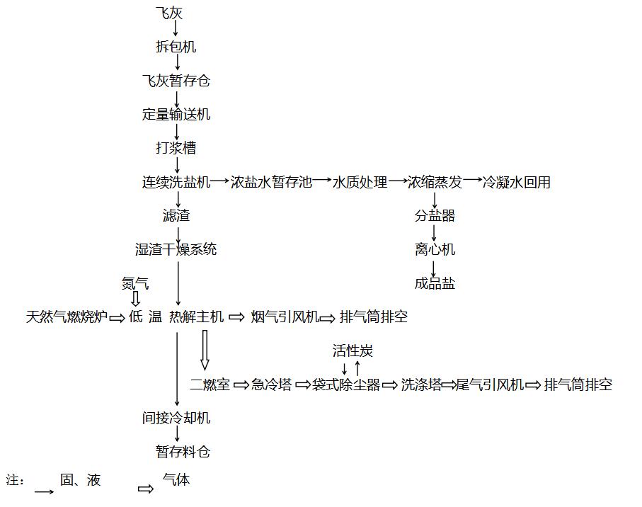 来料飞灰拆包后进入飞灰暂存仓暂存,由定量输送机送入打浆槽与水打浆,灰浆再泵送至连续洗盐机进行多级梯度过滤逆流洗涤后清理掉可溶性盐,飞灰水洗设计冗余水洗次数可多至5次,氯离子可降至0.5-1%,合格的脱氯飞灰经过皮带输送至干燥系统进行烘干处理,烘干后灰渣水分小于1%,然后再进入低温热解主机在氮气保护氛围回内完成二噁英的解毒过程,飞灰热解时间不小于120分钟,释放出热解气再经过二燃室1100℃高温燃尽,急冷塔急速降温至200度以下,尾气再经过活性炭吸附、袋式除尘器除尘、洗涤塔洗涤后,由尾气引风机排空。飞灰洗涤盐水再经过水质处理后进入浓缩蒸发系统,蒸发后盐水利用氯化钠和氯化钾在水中溶解度随温度变化差异的基本原理将两者分离,也可以直接出混盐。