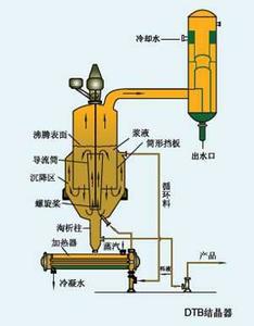 DTB(DTB= Drabt Tube Babble)是指导流桶、挡板两个词,所以该类型应该叫做导流桶、挡板类型结晶器,在工业上有很多种结构,内部导流桶一般做成变径(下细上粗)以保证导流桶顶端的流速较温和,形成均一的过饱和度区,防止喷溅,减轻结晶器表面结晶疤。其基本组成有沸腾室、导流筒、螺旋桨搅拌器、沉降罐、淘析柱。一般情况下,根据物料的不同,配套有真空冷凝器、晶浆加热器或晶浆冷却器。本结晶器适用于晶体在母液中沉降速度大于3毫米/秒的结晶过程。